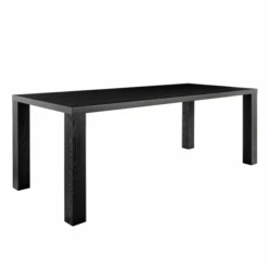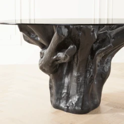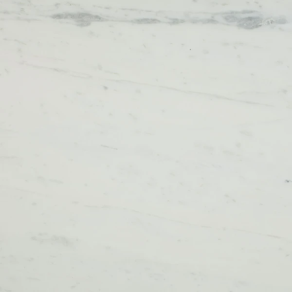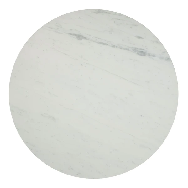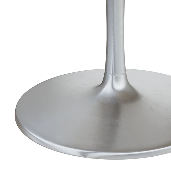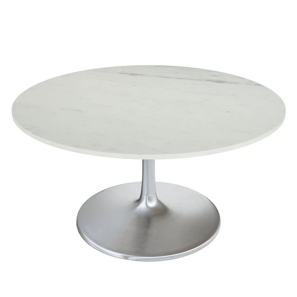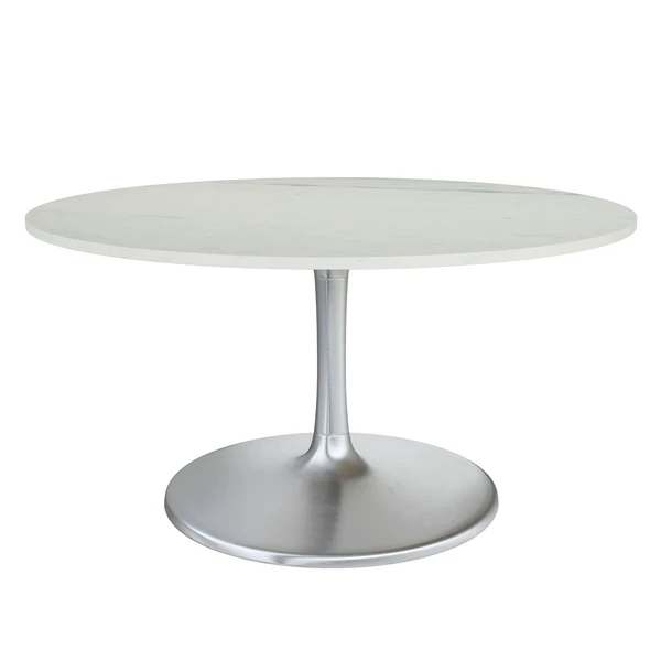 A modern dining table designed with a white marble top featuring unique grey veining and a tulip shaped base in a rich silver finish.