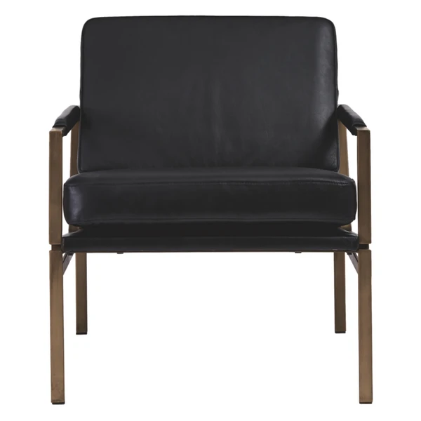 A fresh take on classic midcentury forms, this chair features a sleek metal frame in oil-rubbed bronze with black leather upholstery and matching manchettes.