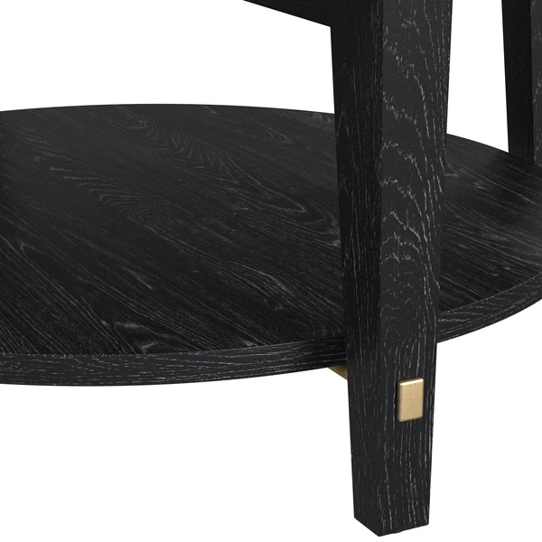 The Bryant Coffee Table has a modern styling, legs and top have interlocking design, constructed with rubberwood solids and flat-cut, cerused oak in a black stain with generous white wax hang-up in the open grain, accented with brushed gold cross bars at the base that pierce through the legs.