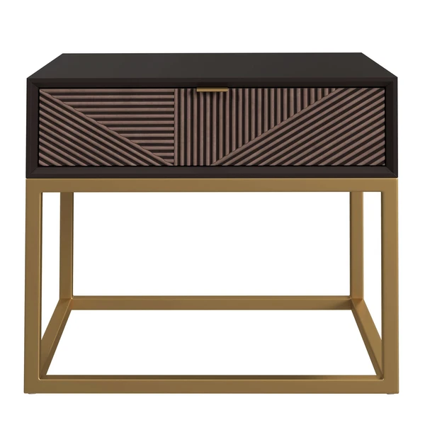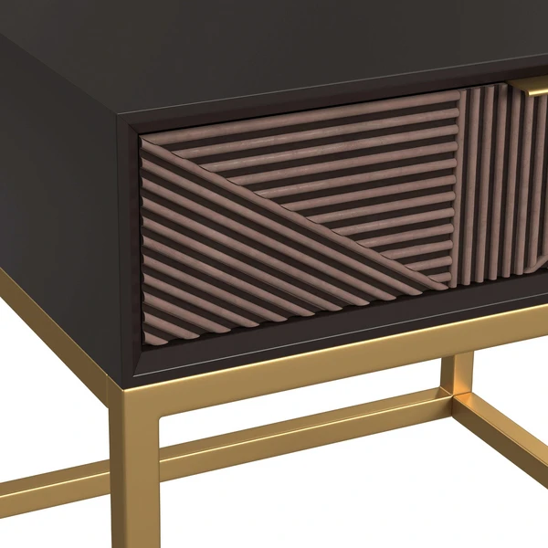 The Cade End Table has one drawer featuring a ridged angled motif and gold linear drawer pulls.