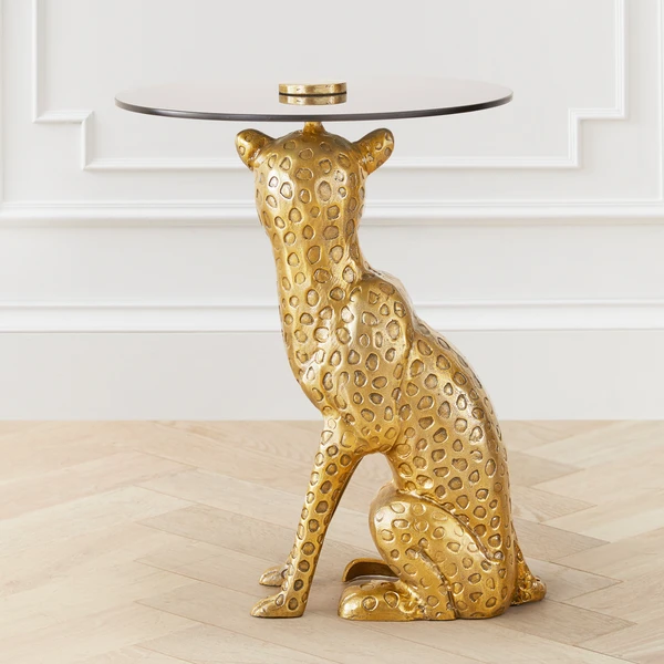 A sleek, modern addition to any decor, this accent table features a smoked glass top and an intriguing gold-finished base in the shape of a cheetah.