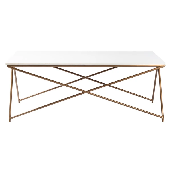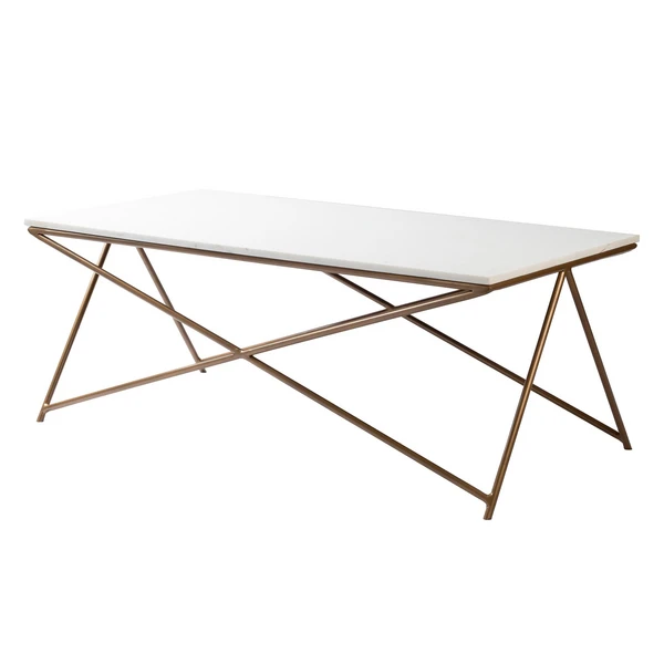 Our Lyon collections geometric legs provides visual interested to any room. A marble top is paired with a painted brass finish.
