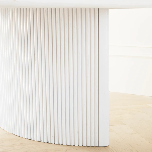 Introducing the Parker dining table x Nikki Chu – a sleek and stylish addition to any home. The simple yet sophisticated design of this table is sure to elevate your dining space with its textured and visually interesting features. Meticulously crafted from solid and veneer oak, this dining table features a stunning white finish. The curved legs are designed with vertically reeded overlays, adding depth and character to the piece. The rectangle top showcases hand turned rounded edges, bringing elegance and charm to the overall design. With its generous size, this table comfortably seats up to 6 people.