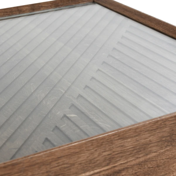 Designed as a modern showpiece, this end table features a sharp, linear pattern carved into its top. Glass protects the etched design with a gleaming, reflective surface. With its warm wood finish, this piece suits any color scheme.